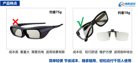 2、采用主流的圓偏振眼鏡(也稱不閃式),無環(huán)境光影響,不閃爍,無需充電,輕薄,成本低。