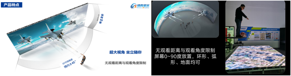 4、最大視角可達120度,環(huán)形、弧形、地面均可,且無觀看距離限制。